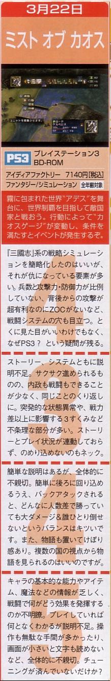 MIST OF CHAOS(ミスト オブ カオス) アイディアファクトリー ファミ通クロスレビュー評価 4/3/4/5 10点評価 <コメント抜粋> ・ストーリー、システムともに説明不足 ・とにかく見た目がいいわけでも無く何故PS3? ・全体的に不親切 ・画面が小さいと文字も読めない ・物語も置いてけぼり感あり ・情報が不鮮明 ・のめり込めない