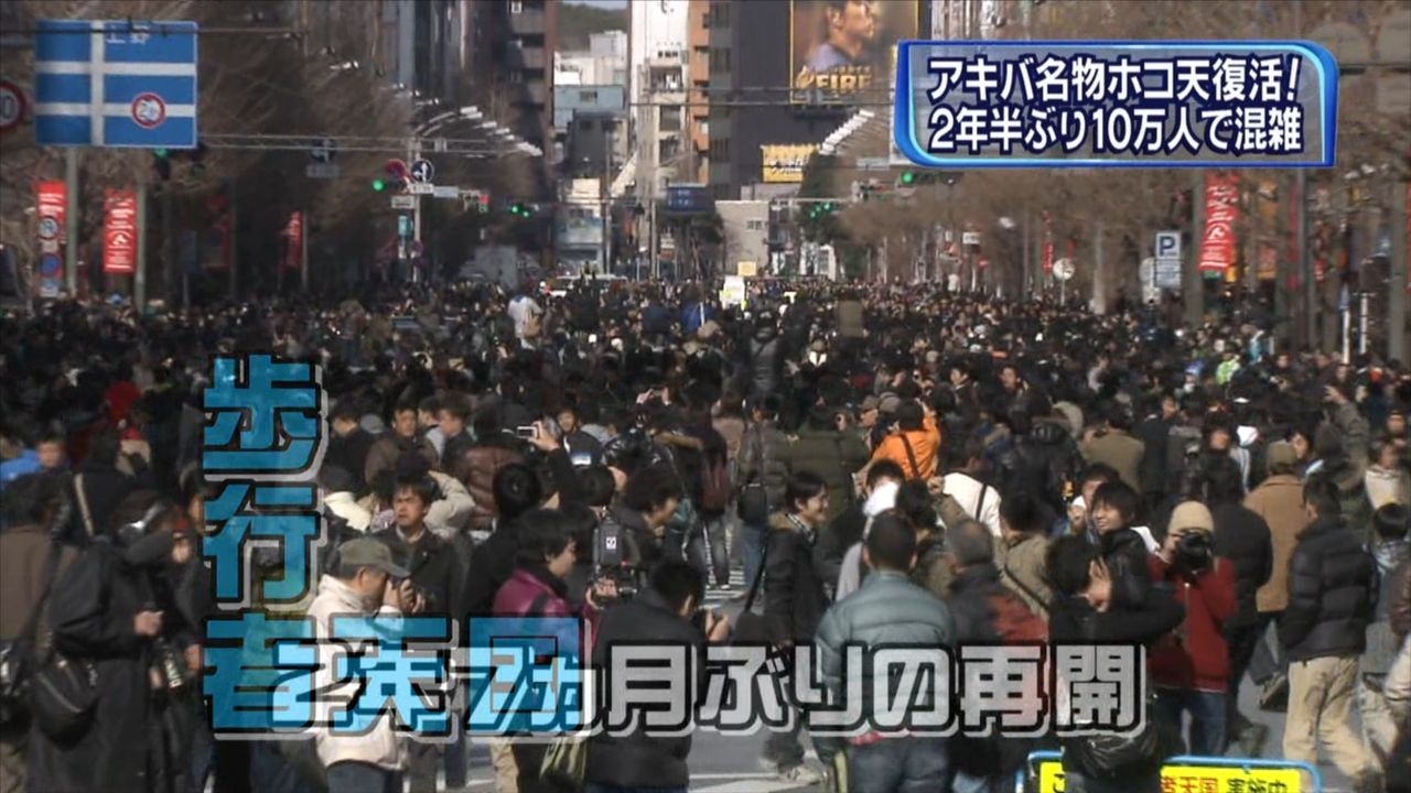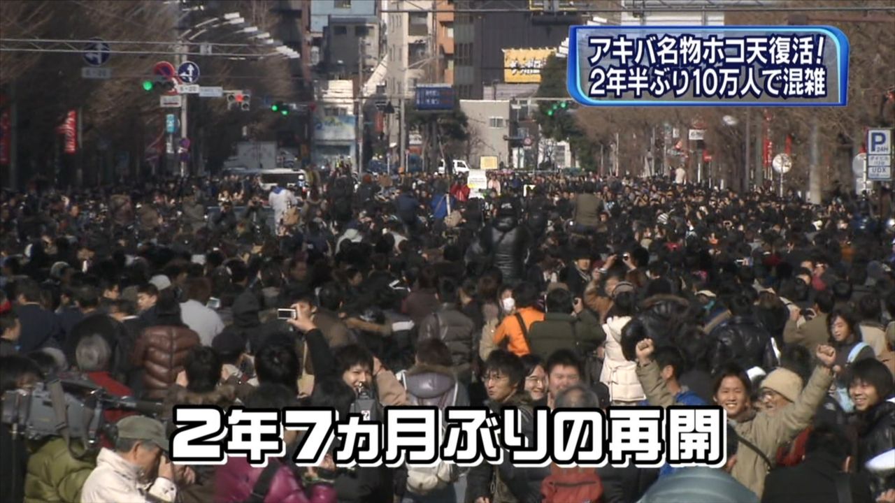 東京・秋葉原の歩行者天国が23日午後、約2年7カ月ぶりに再開した。