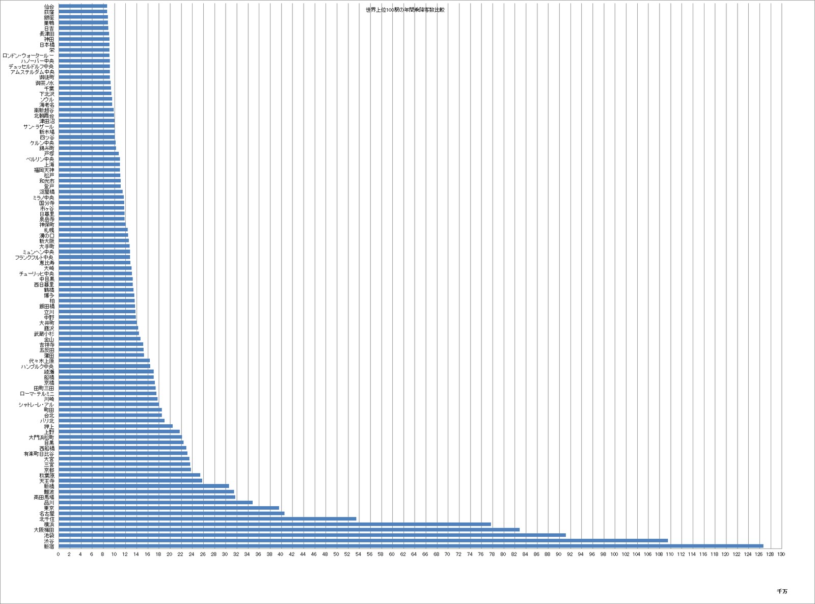 世界上位100駅の年間乗降客数比較
