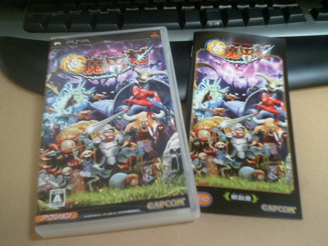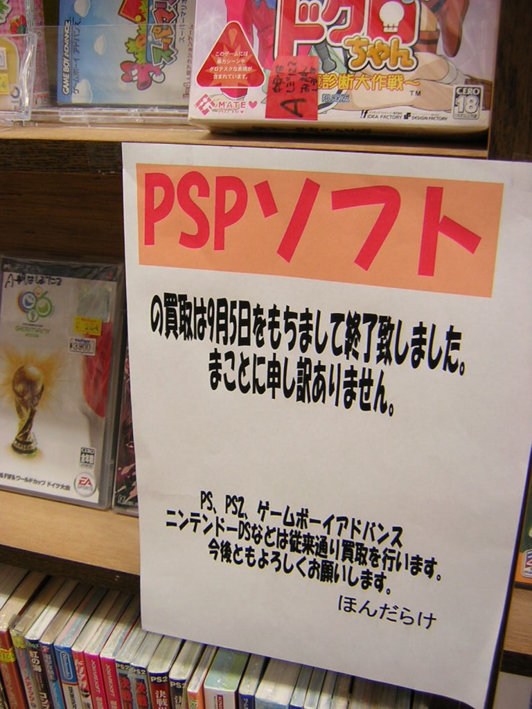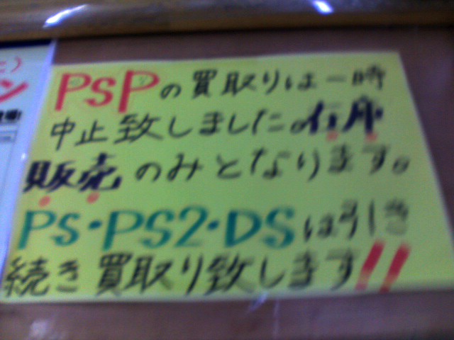 PSPの画面をカメラで写してテレビに映すわけですが、画像はひどいものです。ピントをあわせたり明るさを調整したりはできるのですが、それがどうしたというくらいなモノです。「モンスターハンターポータブル」をつないでやったのですが、画面がぶれます。文字が滲んで読めません。やってると、頭が痛くなってきます。