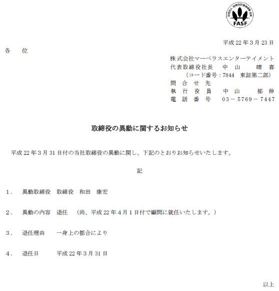 マーベラスエンターテイメントの取締役、和田康宏氏が3月いっぱいで取り締まり役から辞任するようです
