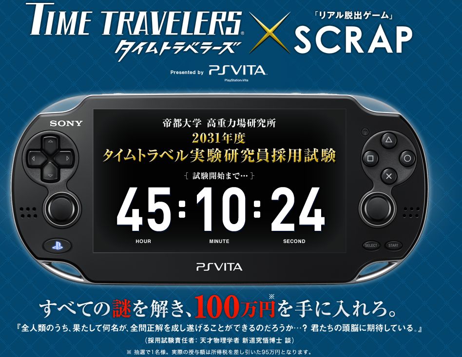 『タイムトラベラーズ』×『リアル脱出ゲーム』のSCRAP!Presented by PS Vita『2031年度タイムトラベル実験研究員採用試験 - 全ての謎を解き、100万円を手に入れろ!』 | プレイステーションR オフィシャルサイト