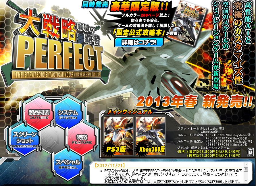 PS3/Xbox360版「大戦略PERFECT〜戦場の覇者〜」につきまして、クオリティの更なる向上を目指すため、発売を2013年春に延期することになりました。発売日につきましては、決定次第発表いたします。