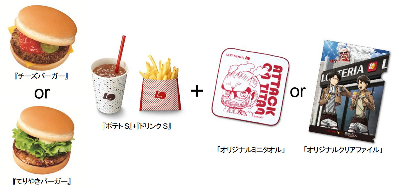 『進撃の巨人セット』は、『チーズバーガー』もしくは、『てりやきバーガー』+『ポテトS』+『ドリンクS』に、「進撃の巨人」ちみキャラデザインの「オリジナルミニタオル」もしくは、エレンとリヴァイがロッテリアの商品を食べているロッテリア限定描き下ろしデザインの「オリジナルクリアファイル」をセットにしました。
