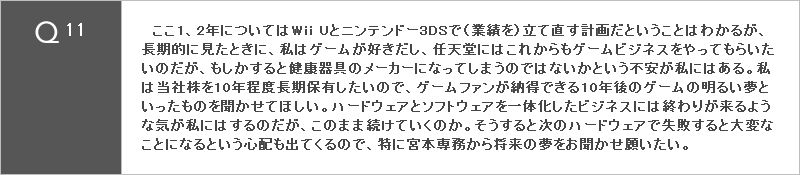 ここ1、2年についてはWii Uとニンテンドー3DSで(業績を)立て直す計画だということはわかるが、長期的に見たときに、私はゲームが好きだし、任天堂にはこれからもゲームビジネスをやってもらいたいのだが、もしかすると健康器具のメーカーになってしまうのではないかという不安が私にはある。私は当社株を10年程度長期保有したいので、ゲームファンが納得できる10年後のゲームの明るい夢といったものを聞かせてほしい。ハードウェアとソフトウェアを一体化したビジネスには終わりが来るような気が私にはするのだが、このまま続けていくのか。そうすると次のハードウェアで失敗すると大変なことになるという心配も出てくるので、特に宮本専務から将来の夢をお聞かせ願いたい。