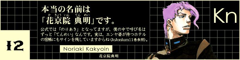 公式では「のりあき」となってますが、僕の中で呼び名はずっと「てんめい」なんです。実はエンヤ婆が待つホテルの宿帳にもサインを残していますからね(ジョジョニウム11巻参照)。