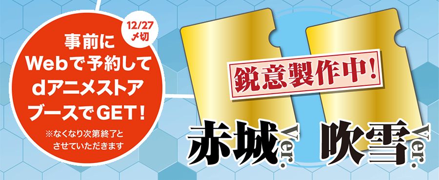 ・また、「dアニメストア」として企業ブースに初出展。「dアニメストア」加入者に特製ノベルティとして「艦隊これくしょん −艦これ−」の描きおろしクリアファイル(吹雪Ver.と赤城Ver.を各1枚・合計2枚)がプレゼントされる。