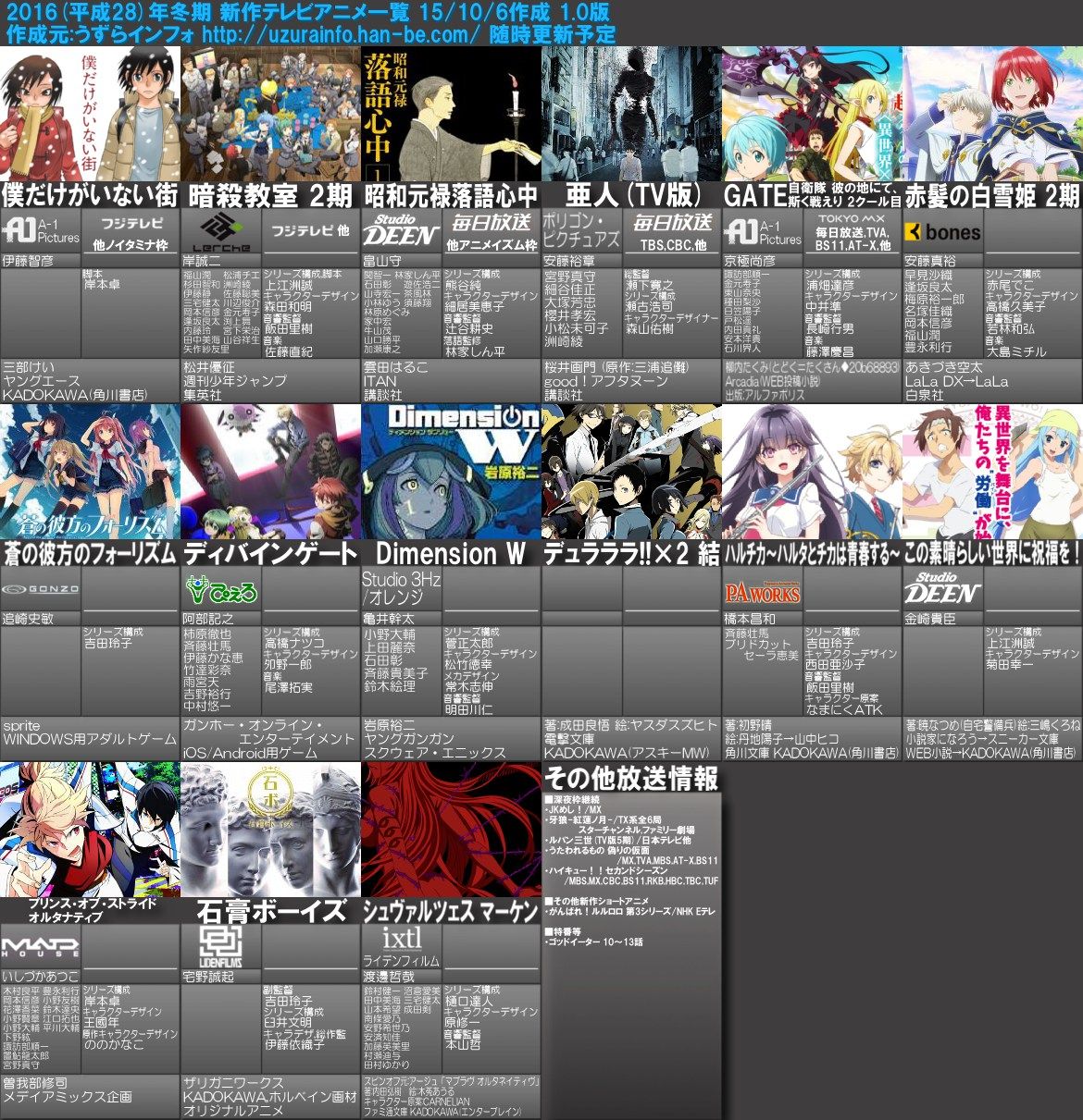 2016年冬期 テレビアニメ一覧画像 うずらインフォ