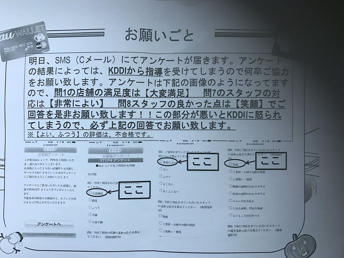 昨日auショップ行ったら、アンケートの回答内容指示する紙もらったんやけど… pic.twitter.com/0TwanLMRJL