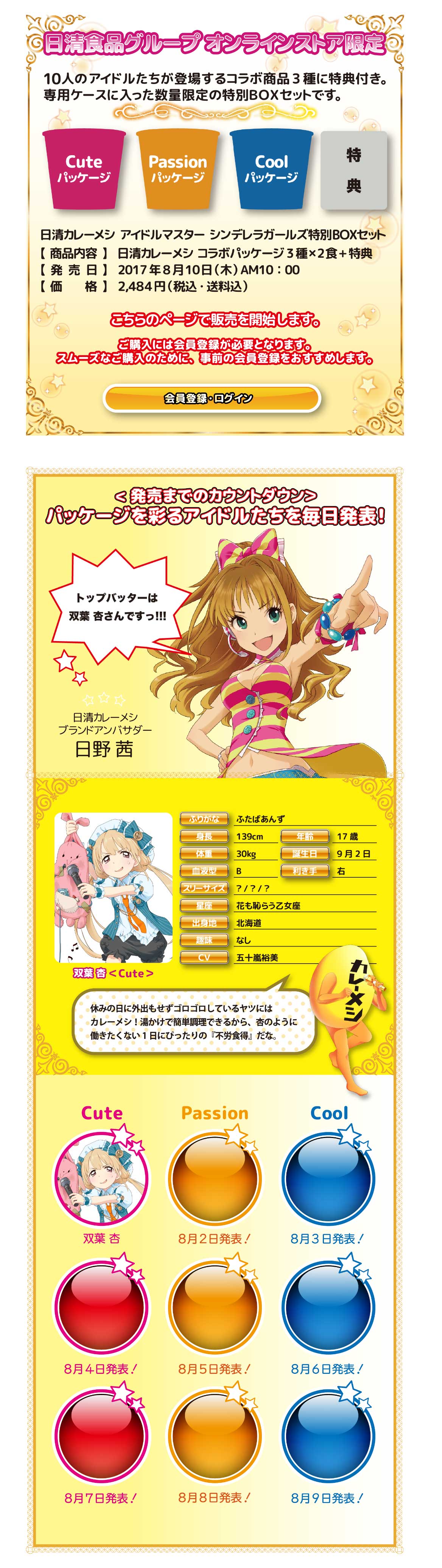 8月10日AM10:00から、描き下ろしイラストを使用した特典がセットになった「日清カレーメシ アイドルマスター シンデレラガールズ特別BOXセット」を特設サイト限定で発売します。