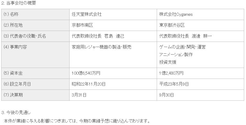 なお、両社の協業を円滑に進めるために、任天堂はCygamesの発行済株式数の約5%を、主に同社保有株式の第三者割当により取得いたします。