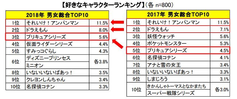 バンダイが6月21日に発表した「お子さまの好きなキャラクターに関する意識調査」によると、2018年のトップ3は「それいけ!アンパンマン」(11.5%)、「ドラえもん」(8.0%)、「プリキュアシリーズ」(5.6%)だった。