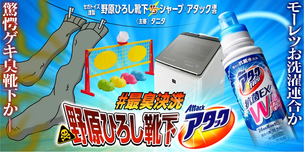 きょう開催される「セガ “野原ひろしの靴下” vs 花王アタック・シャープ洗濯機連合の #最臭決洗 」をひっそり見守ろうとしていたら、シャープさんと花王さんから爆弾級な誘いが飛んできた件。 pic.twitter.com/acNLeJfPeb