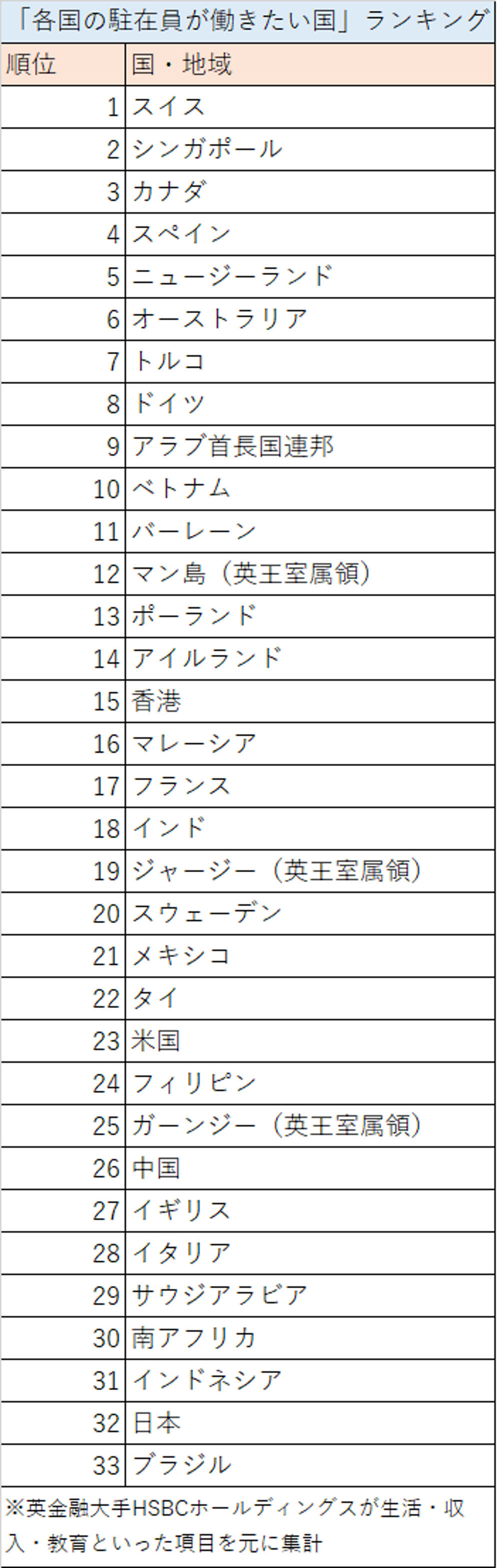 これ、日本なんかを擁護する気はサラサラないけど、調査対象はたった33カ国だからね。中国も韓国も台湾も対象に入ってない。しかもエクゼクティブ限定。日本も生活では15位だし。