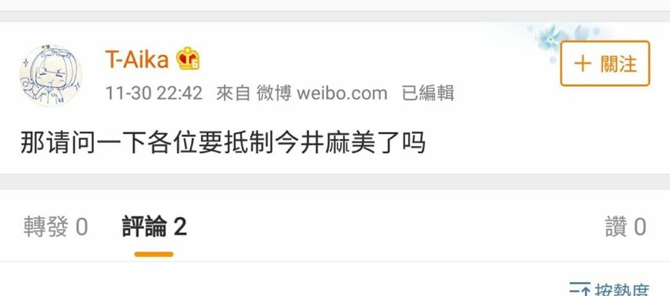 我認為淑女今井麻美能做到這種地步是挺偉大的,她在聲優界這麼久應該知道說這些可能永遠中國封殺失去市場,但仍願對不公與受難表示同情。祝福她事業順利。