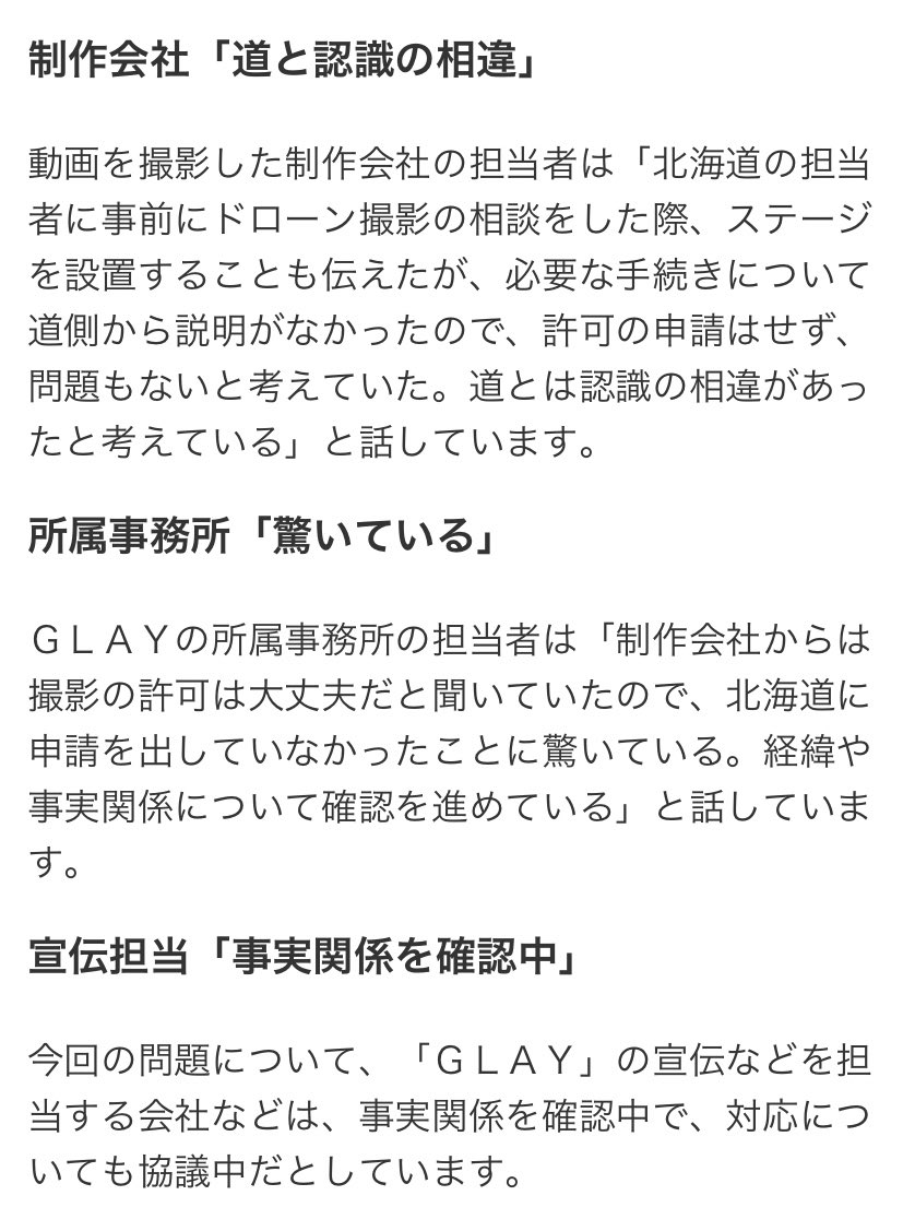北海道出身の人気ロックバンド「GLAY」が今月公開した無観客ライブの動画は、必要な許可を得ずに道立公園で撮影された疑いがあるとして、道は18日、制作会社を行政指導する方針を明らかにした。
