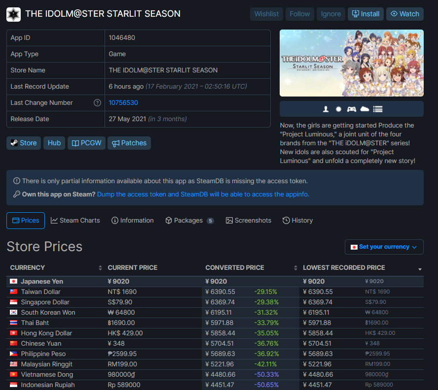 PCゲームプラットフォームSteamでアイドルマスターの新作をダウンロード販売で日本人が買うと9020円。