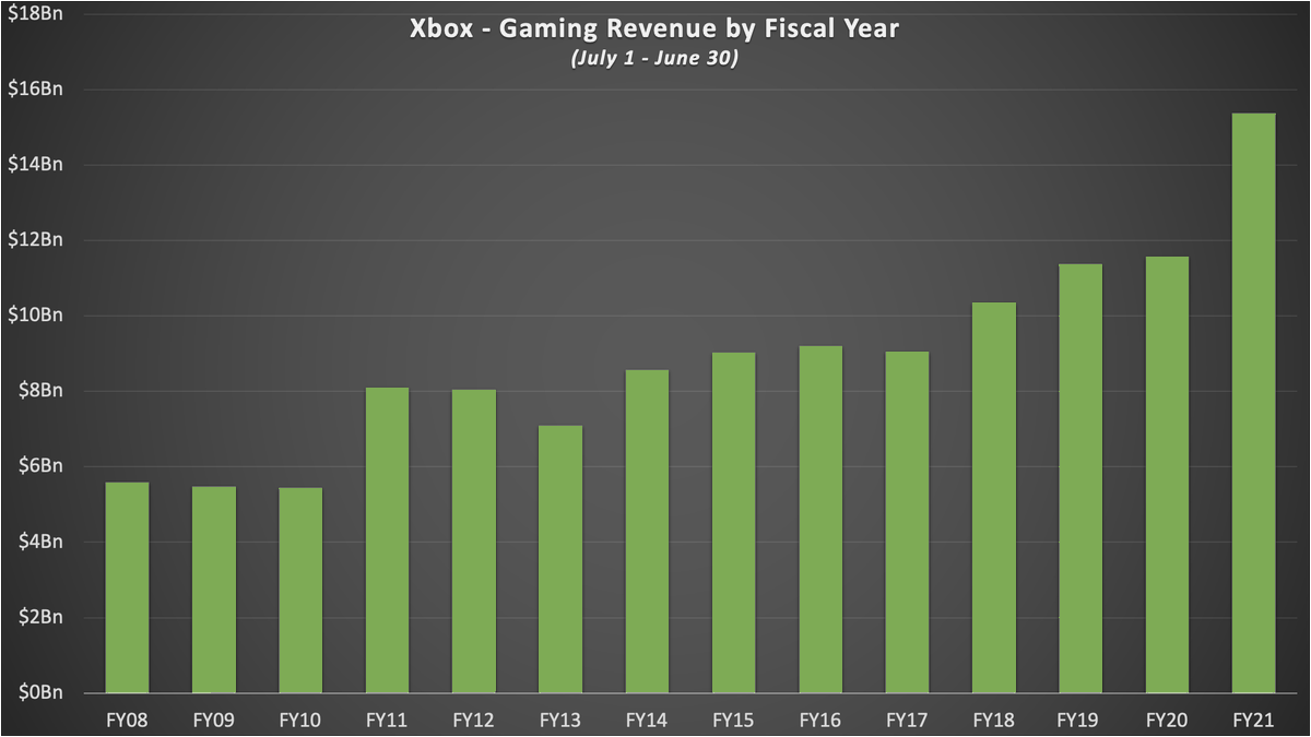 ・Xboxは2021年度に153.7億ドル(約1兆6858億円)の収益をあげた