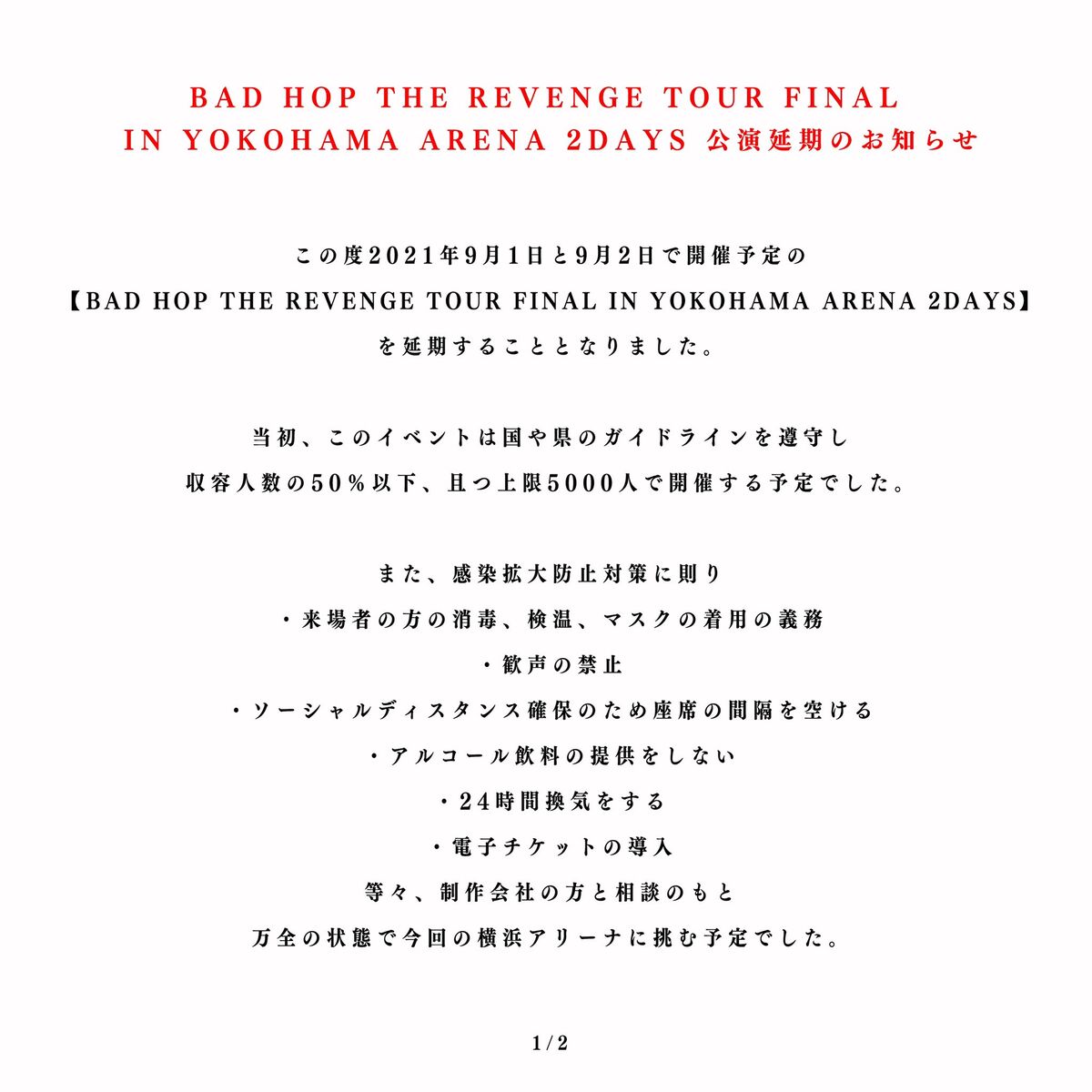 この度9月1日と9月2日で開催予定のBAD HOP THE REVENGE TOUR FINAL IN YOKOHAMA ARENA 2日間を延期する事となりました。
