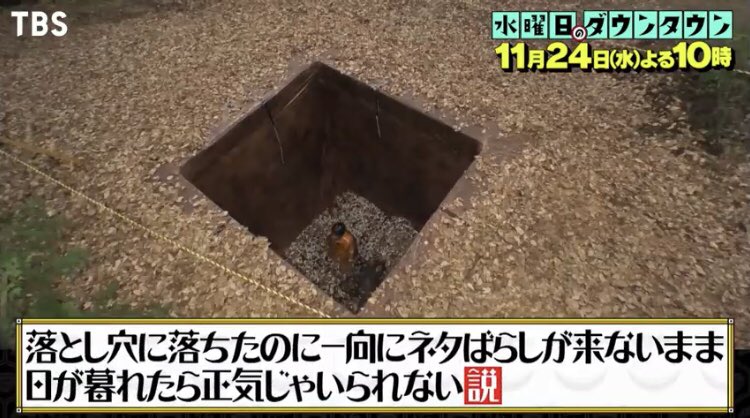 明日24日「水曜日のダウンタウン」の放送は・・・「落とし穴に落ちたのに一向にネタばらしが来ないまま日が暮れたら正気じゃいられない説」深さ3m超えの自力脱出不可能な穴を使用して…芸人たちに超過酷ドッキリ#水曜日のダウンタウン #tbs pic.twitter.com/XhAgcoa192