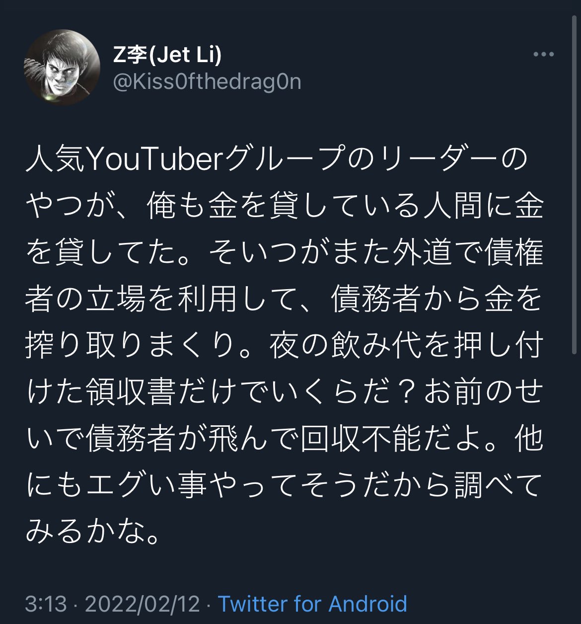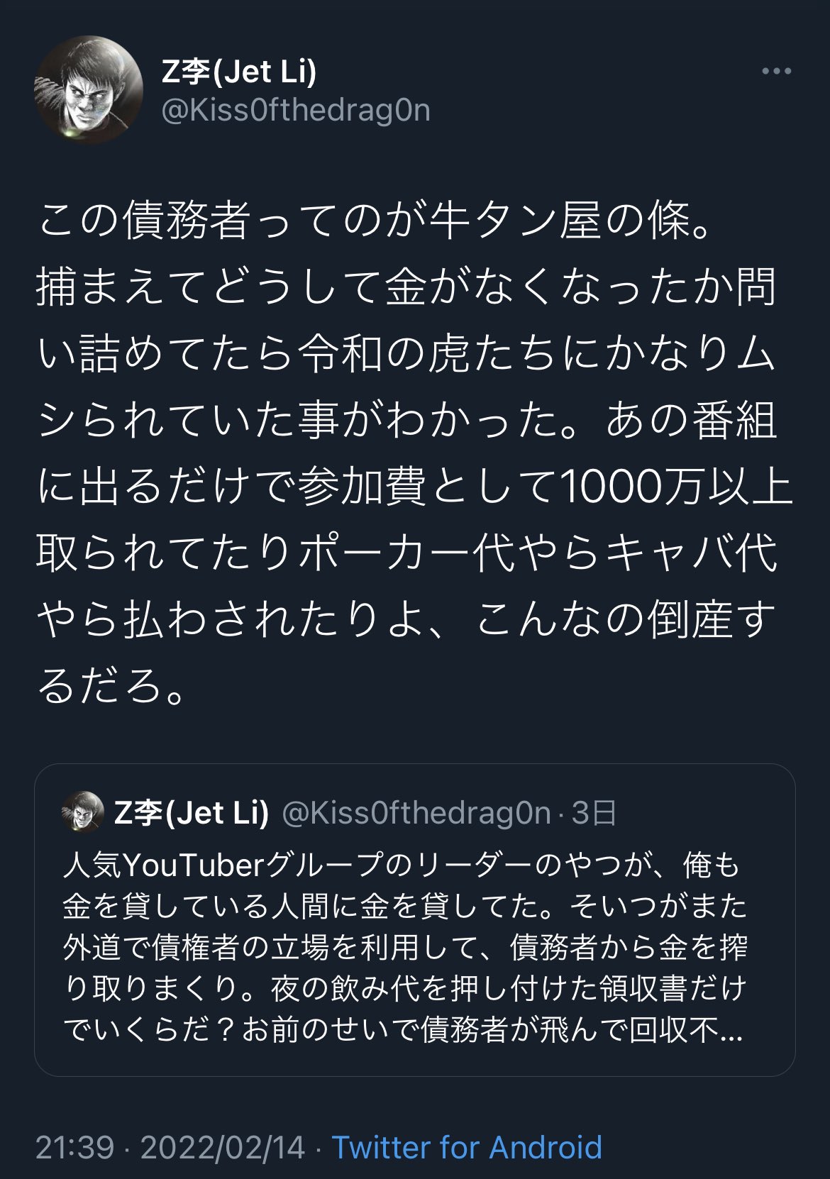 その会社の社長に金を貸していたツイッタラーZ李が令和の虎内での違法賭博などを告発