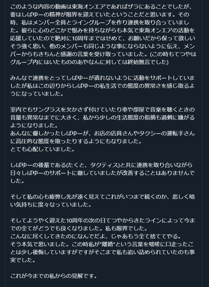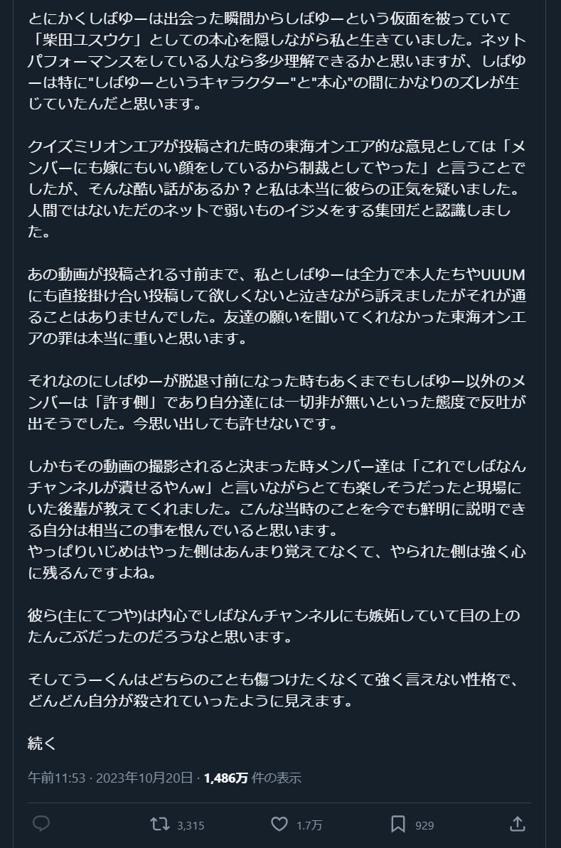 私は、何年か前に東海オンエアの動画として投稿された「クイズミリオンエア」の動画がこの世に出た瞬間から完全に心が壊れ、彼らを心の底でずっと恨み続けながらもそれでもしばゆーのために彼らに寄り添う日々が続いていました。…