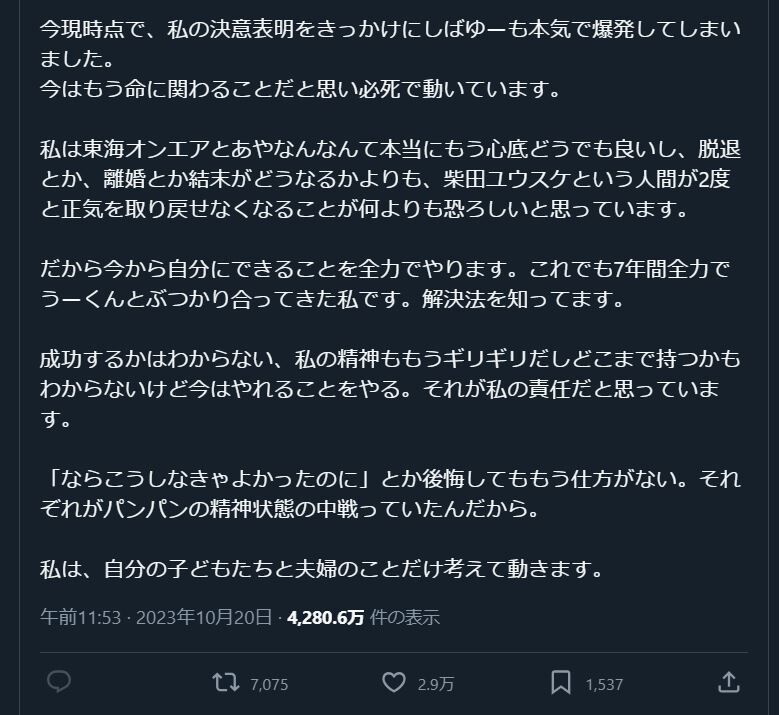 パニック障害を抱えながら、突然世間に向けて爆発し、”離婚”と断言したあなたを、彼なりにエンタメに変え必死に暴走を止めようとしていたしばゆーの最後の優しさを、絶対に忘れないで下さい。