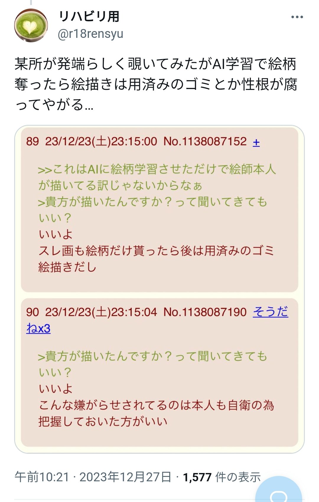 つまりそっちの仲間内ですらこういうのに何も言えないなら生成AIしてる奴全員ゴミカスってことになるけど
