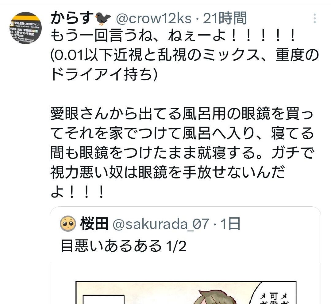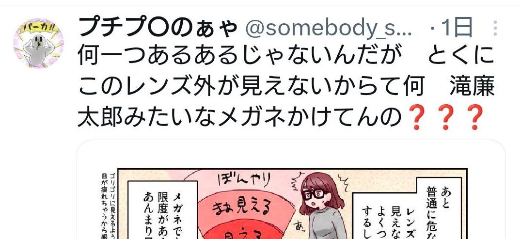 軽度近視を経験後そのま視力低下して超近視になった人が、「俺は正しい・俺が体験している事は全てのメガネ民共有である」と信じて疑わない軽度近視民に叩かれてるんや