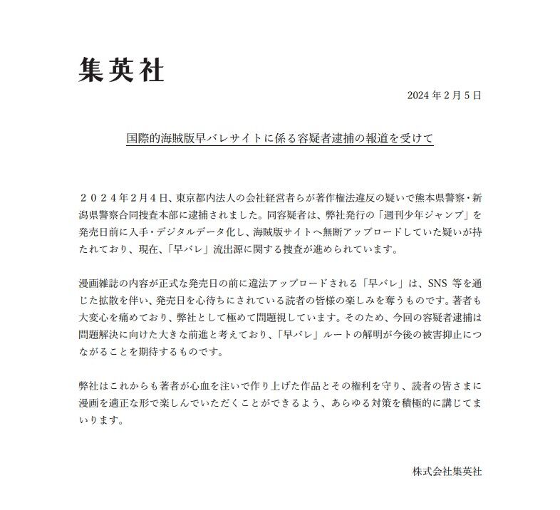 国際的海賊版早バレサイトに係る容疑者逮捕の報道を受けて集英社は5日、公式サイトを通じ、声明を発表した。