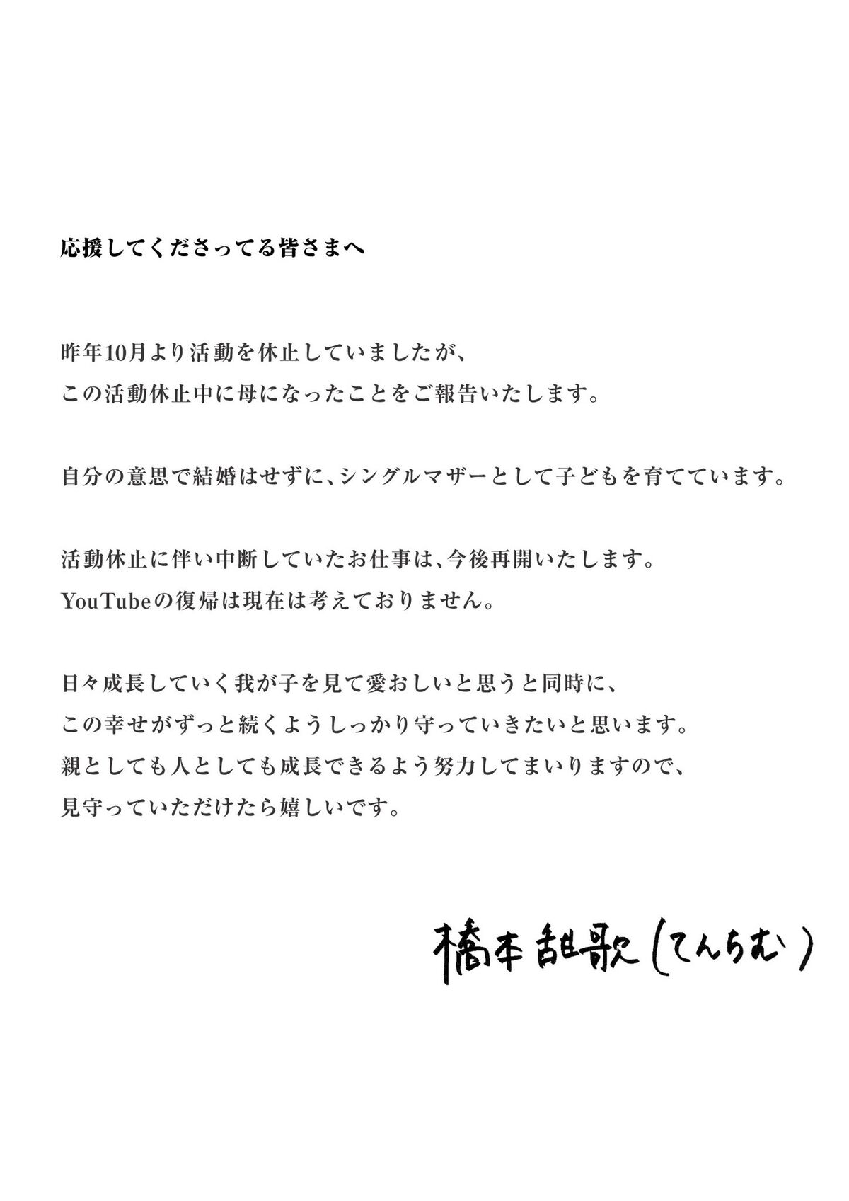 無期限活動休止中のてんちむが出産報告「シングルマザーとして子どもを育てています」 仕事再開も報告