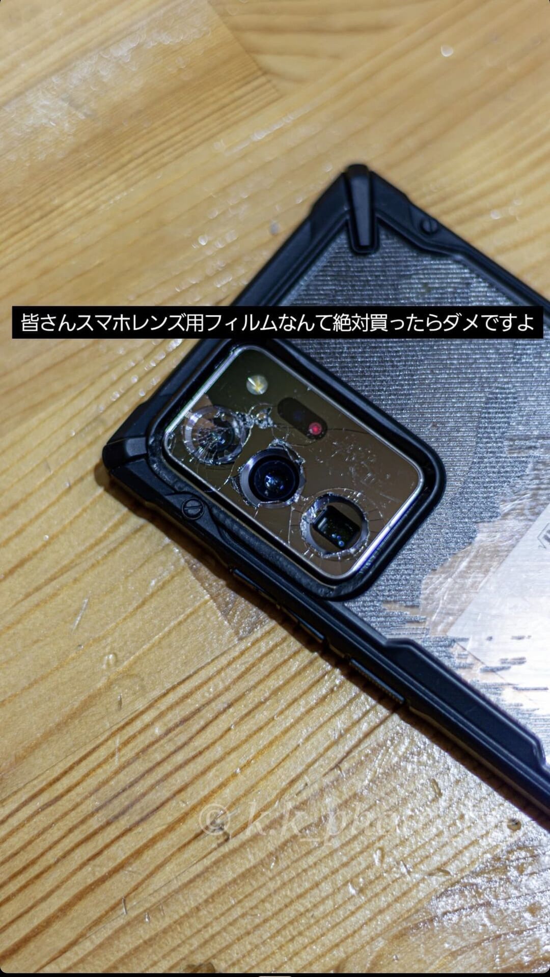 - これ見て、やばいかもって少し剥がしてみたけど大丈夫だったわ。カメラ5個いっこずつ被せる単独のリングタイプのカバー。こういう一度に全部貼るタイプじゃない。s23ウルトラ。この画像のやつが単純に、フィルムカバーがクソだったって事。Androidだからとか関係ない。剥がす前からヒビとかあったんだろうと思うよ。だいたい4年も前のnote20って。。アンドロイド10だろ、古すぎ。今はアンドロイド14だぞ。