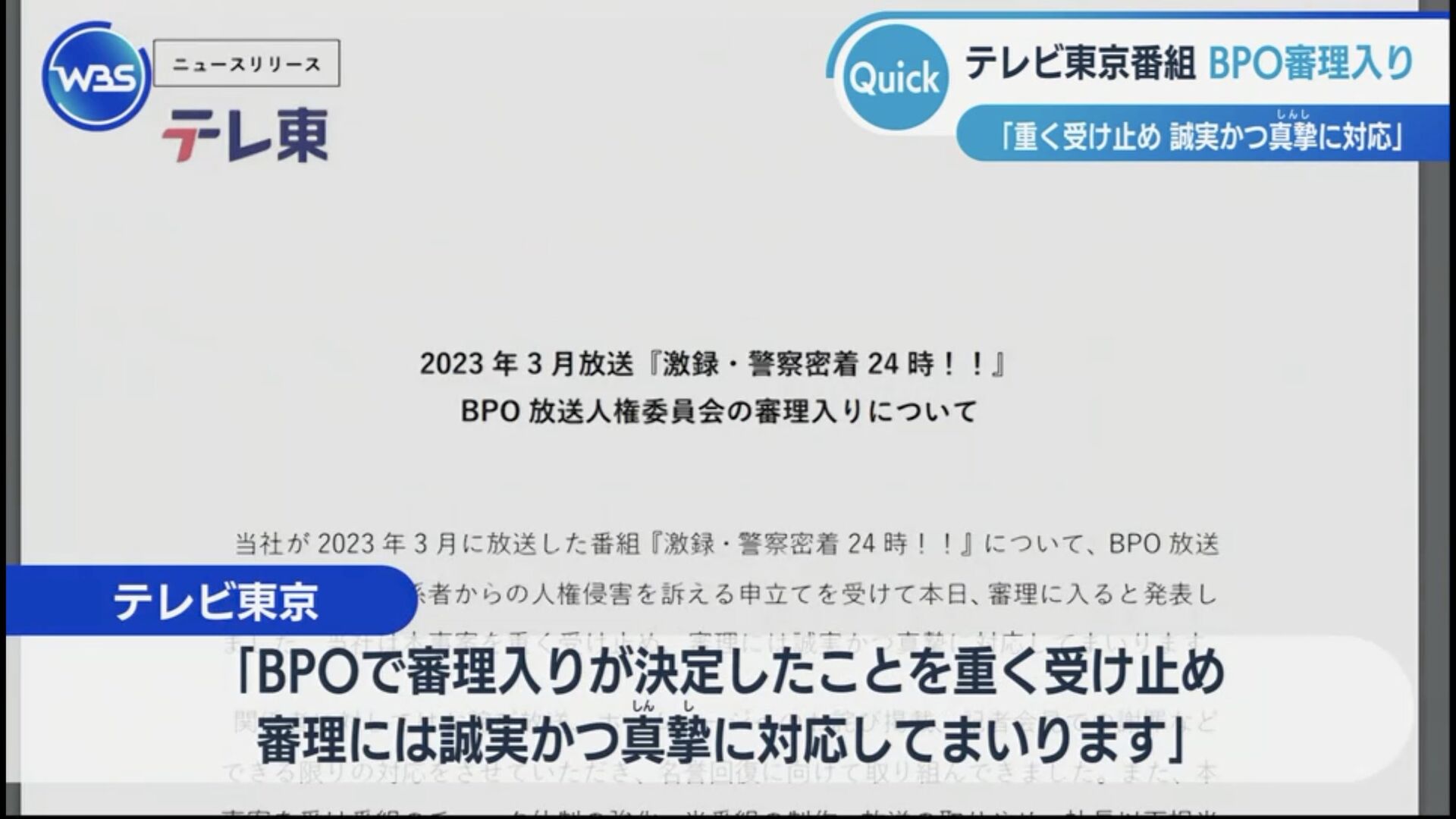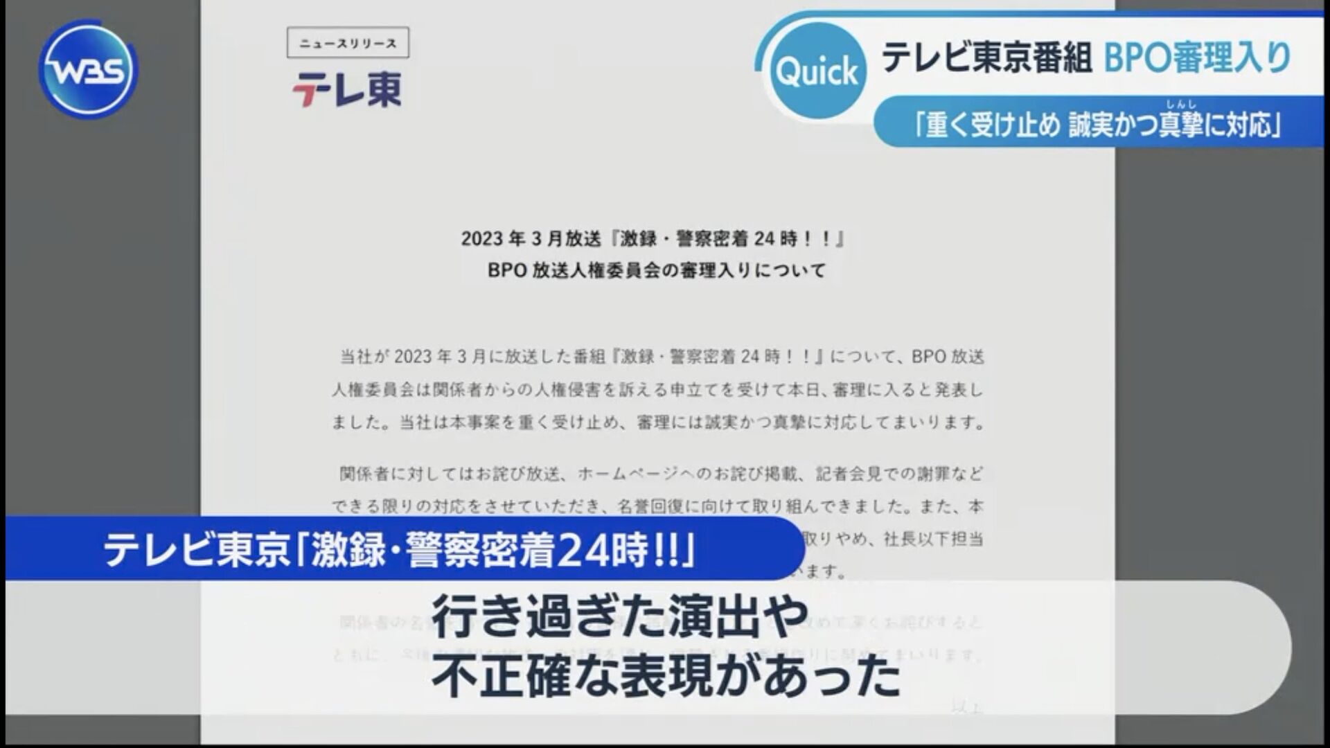 テレビ東京は、19日放送の報道番組「WBS(ワールドビジネスサテライト)」内で、同局の人気番組「激録・警察密着24時!!」が、BPO放送人権委員会の審理に入ったことを報告。