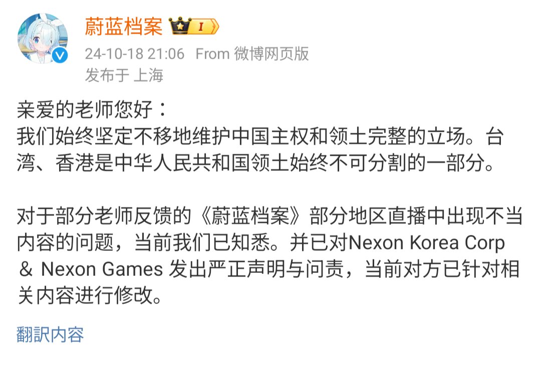 私たちは「ブルーアーカイブ」の海外サーバーの管理を担当している韓国のネクソン「ブルーアーカイブ」チームです。10月18日金曜日のグローバルサーバーライブ放送中に、「一つの中国」政策を尊重するという私たちの約束に沿わない誤った発言をしたことを心からお詫び申し上げます。