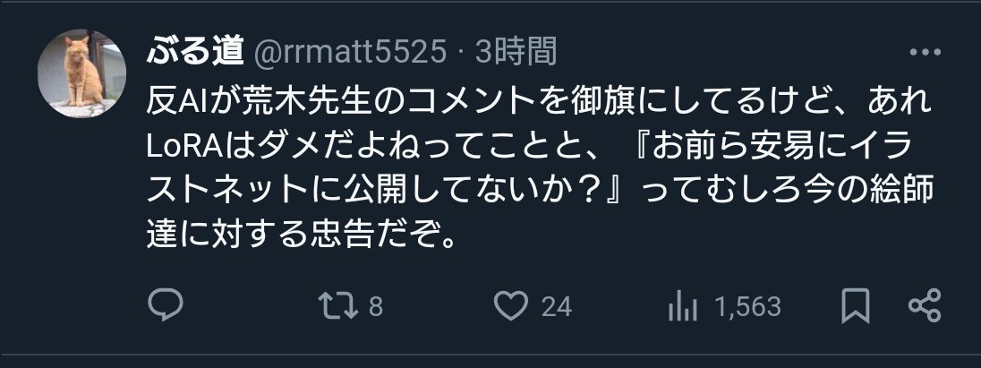 AI推進派が「荒木先生はAIではなく著作権侵害に対して怒ってる(AIに怒ってる訳じゃない)」と都合よく解釈してるが、