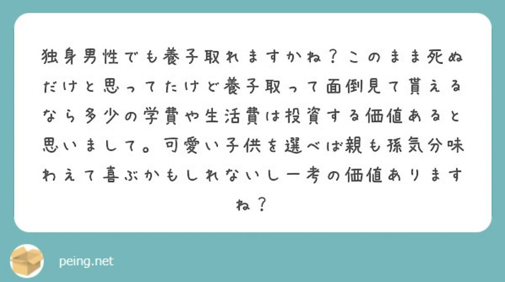 血縁でもない限り独身男性が養子や里子を迎えることは不可能に近い。子どものリスクを考えたら絶対認めるべきじゃない。「ケアが必要な子ども」に自分のケアをさせる為に引き取るとか正気の沙汰じゃない。本気だろうと釣りだろうとその発想自体が気持ち悪い。 pic.twitter.com/Q65PpW2HGs