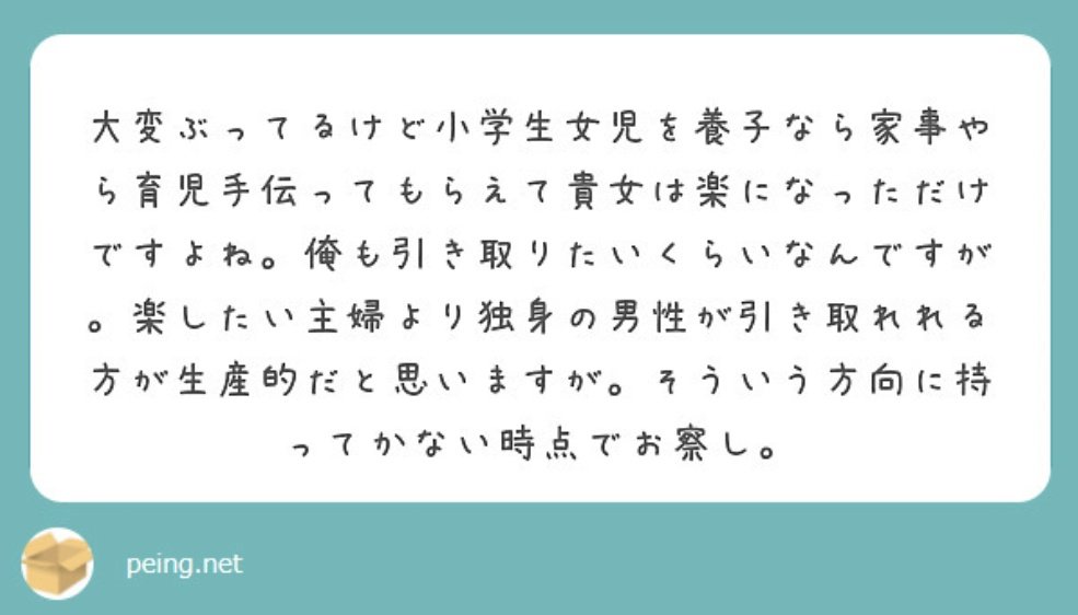 これ女児の養子だから異常性がはっきり見えてるけどこの感覚でケアのために妻という奴隷欲しがってる男は当たり前のようにゴロゴロいるんだよな