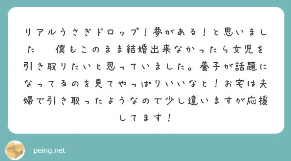- 妻が二人目の子どもを産んだ時に胎盤剥離で死にかけたので金銭的余裕から3人目の子どもとして養子を取ろうと思った事はあるがこんな発想は一ミリも思わなかったわ