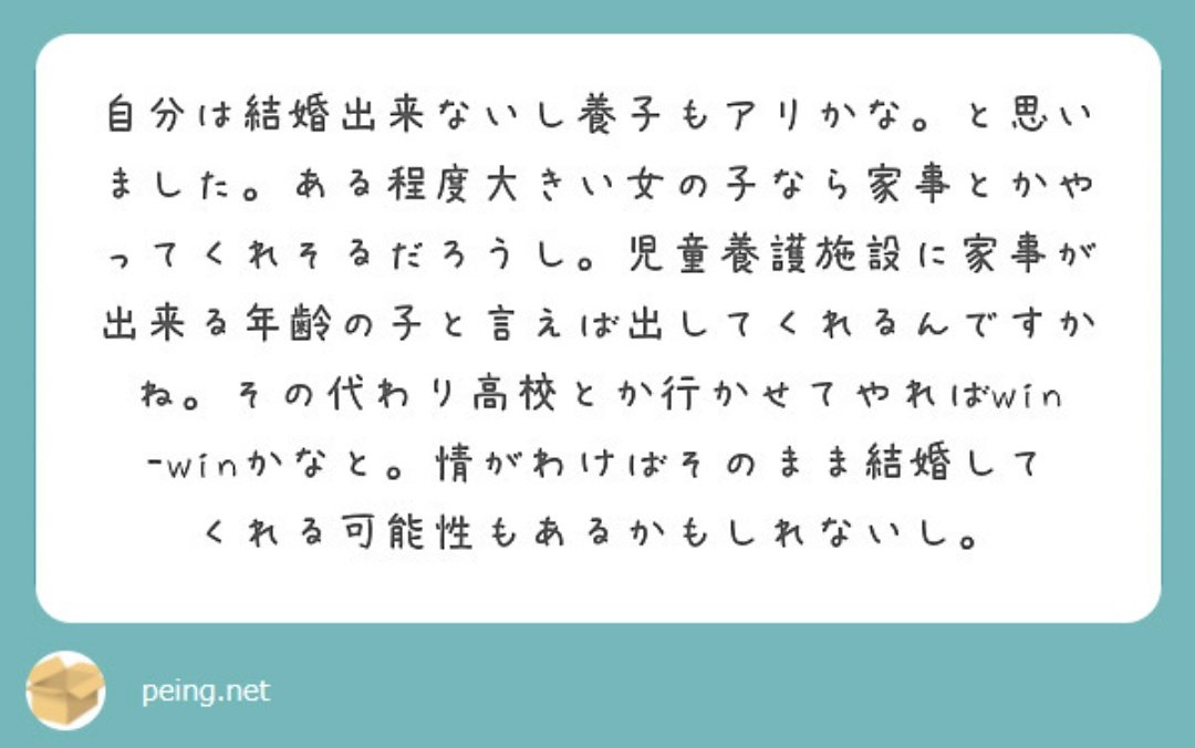 発想がもう気持ち悪すぎるし、施設の人だって独身男に女の子を養子や里子に出すわけが無いの普通に考えたらわかることなのに、異常なこと考える人って本当に脳の構造から普通の人とは違うんだなと痛感しました😌