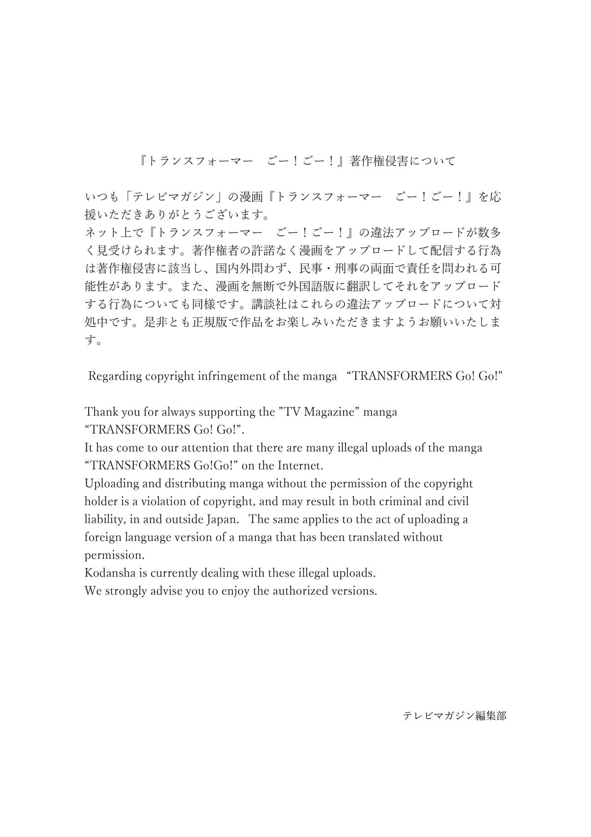 Regarding copyright infringement of the manga “TRANSFORMERS Go! Go!" pic.twitter.com/EjHZAAQ80D