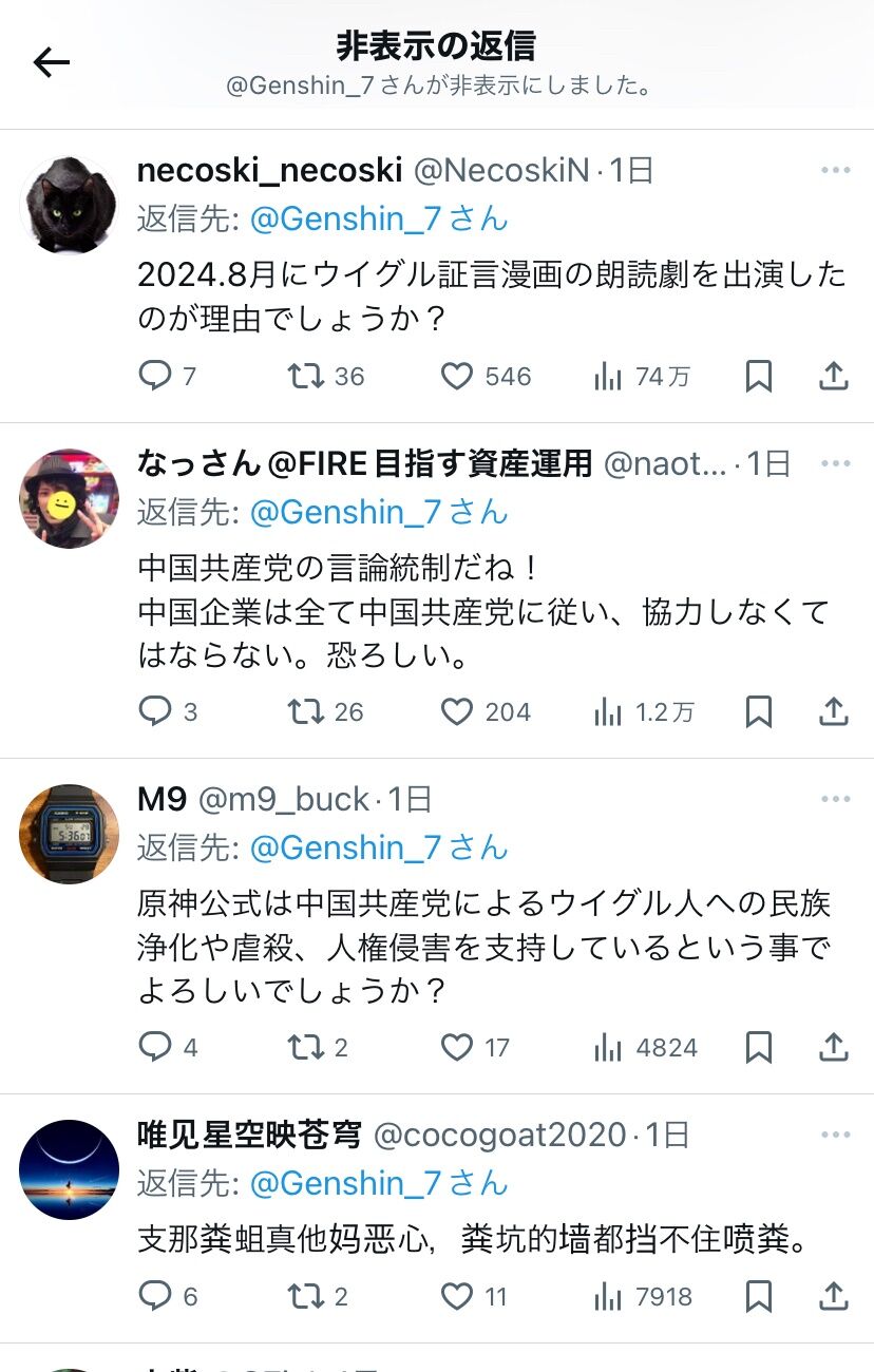 原神公式アカウント、都合の悪いリプを次々非表示に