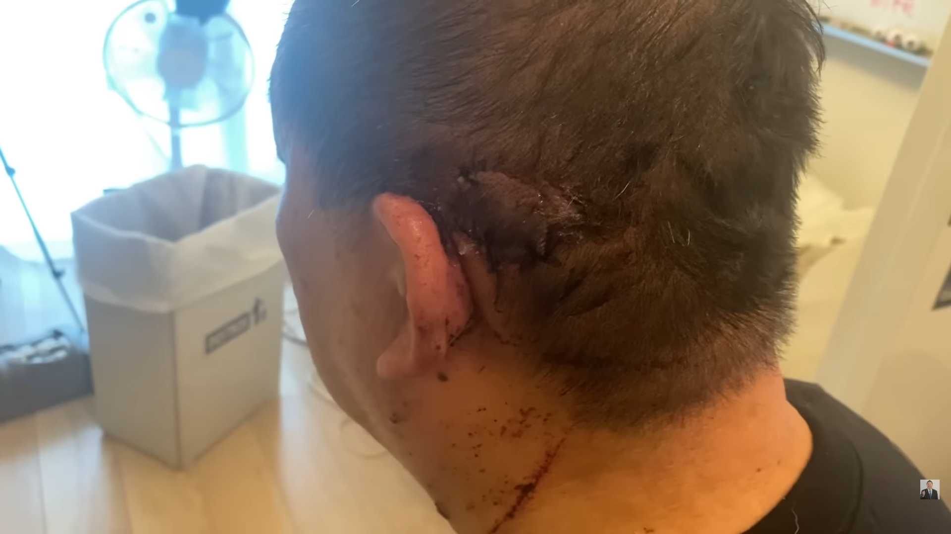 左斜め後ろから自撮りをする形で「耳の後ろ側の頭皮がベロッと剝がれてたんですね」と説明。傷の深さが1センチほどあったそうで、医師からは「耳が切り取られなくてよかったね」と言われたという。処置が早かったため、剝がれた頭皮の部分への皮膚移植は必要なかった。