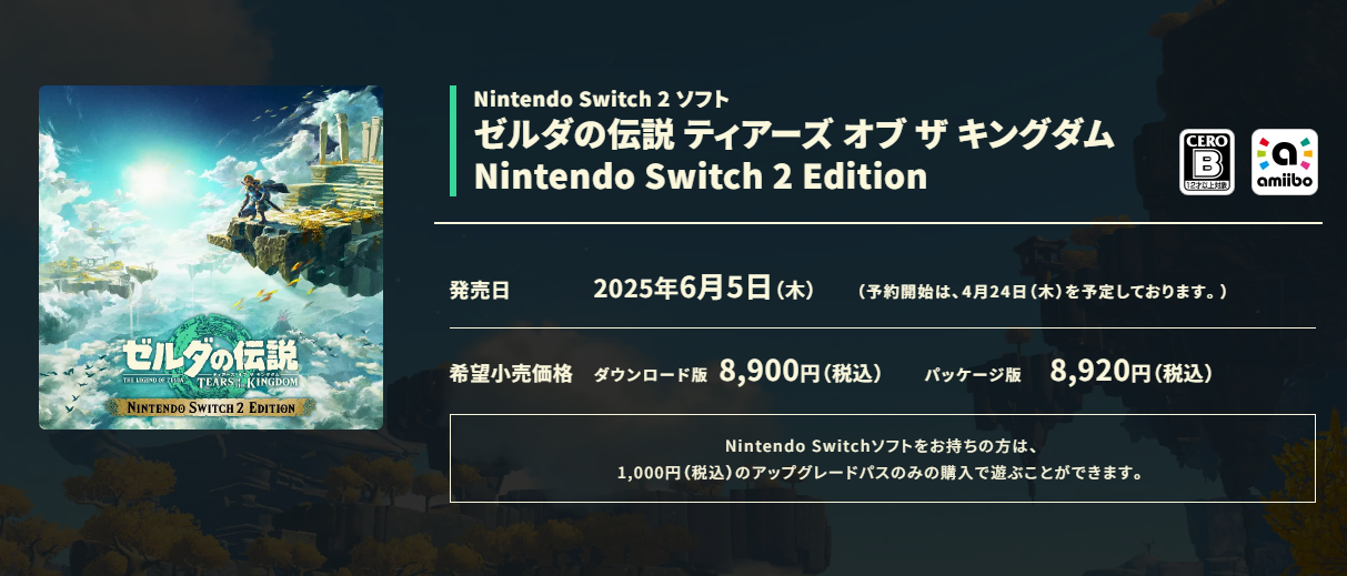 ゼルダは2作ともスイッチ2エディションの価格が、元のスイッチ版+1000円だからな。