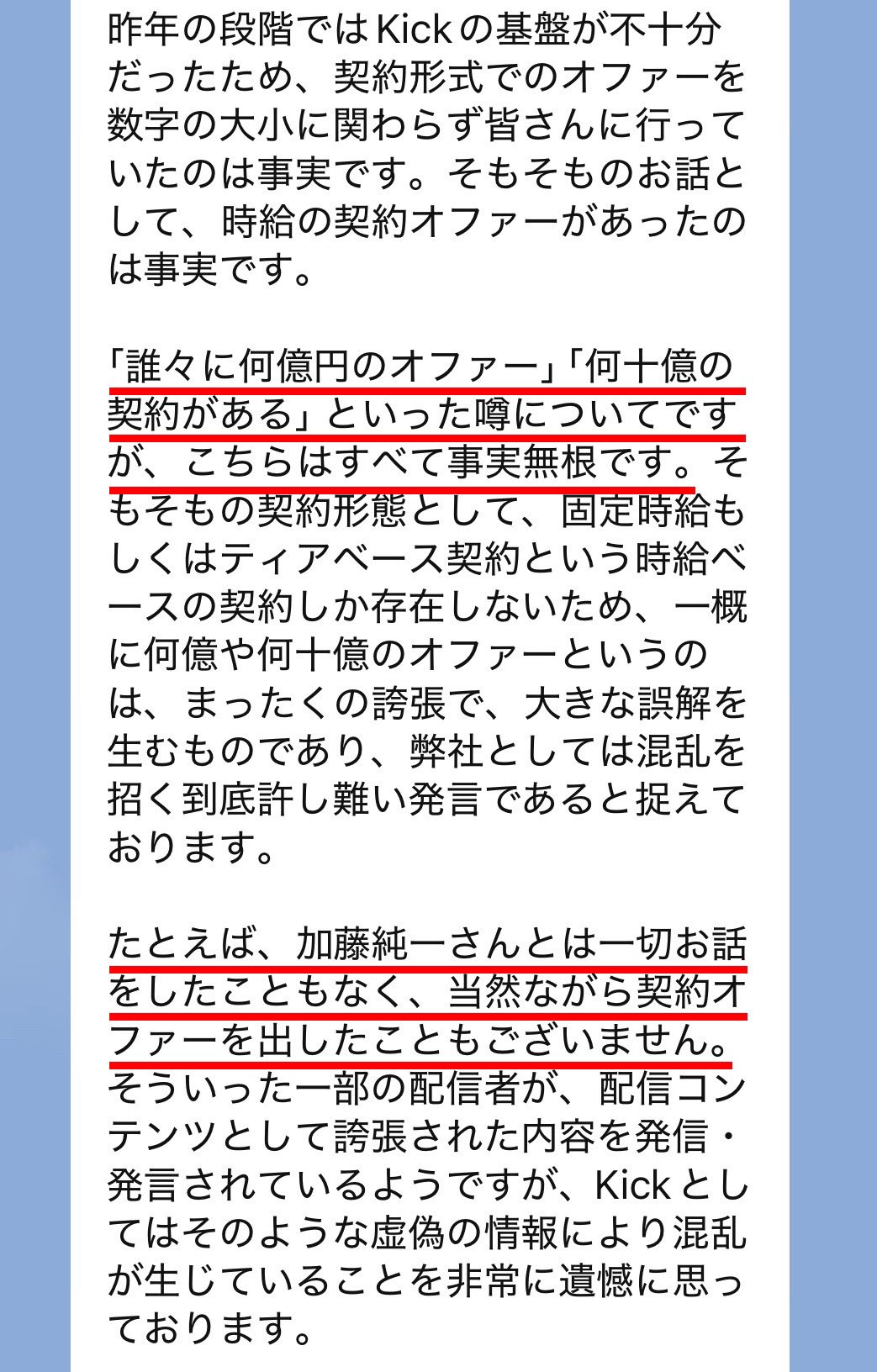KICK運営「加藤純一とは弊社としてはこれまで一度も"契約金"というお話をさせていただいた事実はない。」