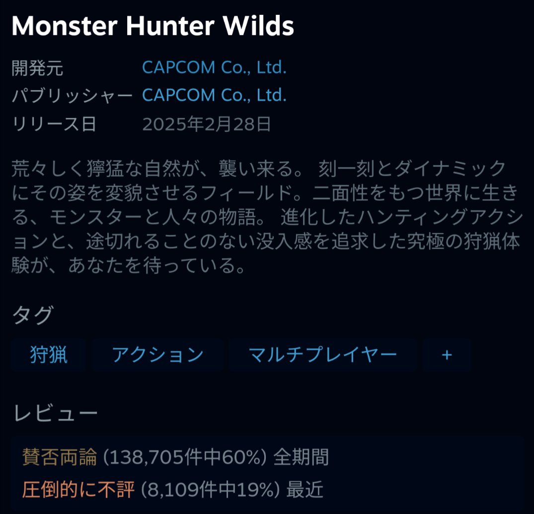 ワイルズのSteam直近評価が圧倒的不評まで落ちました。