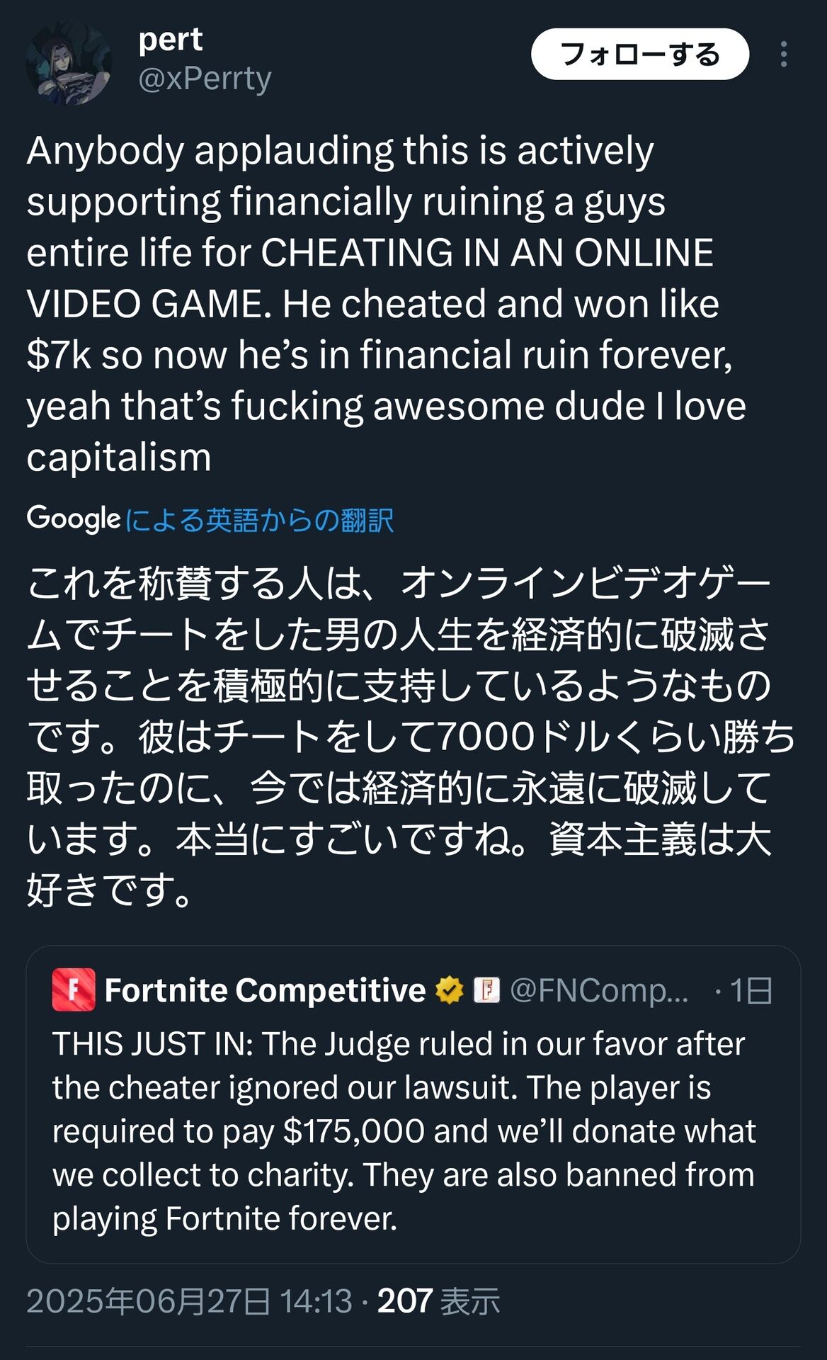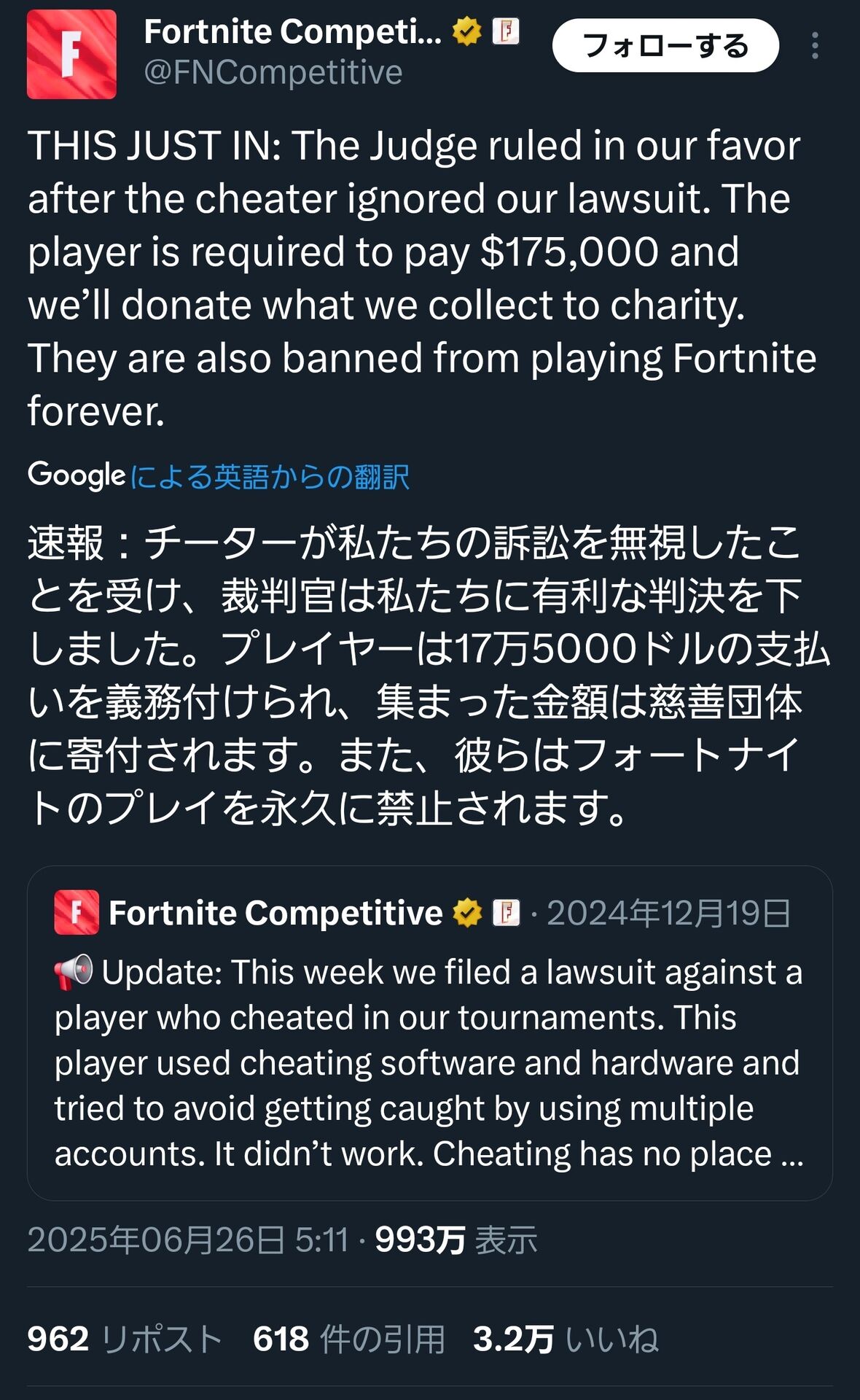THIS JUST IN: The Judge ruled in our favor after the cheater ignored our lawsuit. The player is required to pay $175,000 and we’ll donate what we collect to charity. They are also banned from playing Fortnite forever. https://t.co/on0dYWBdq4