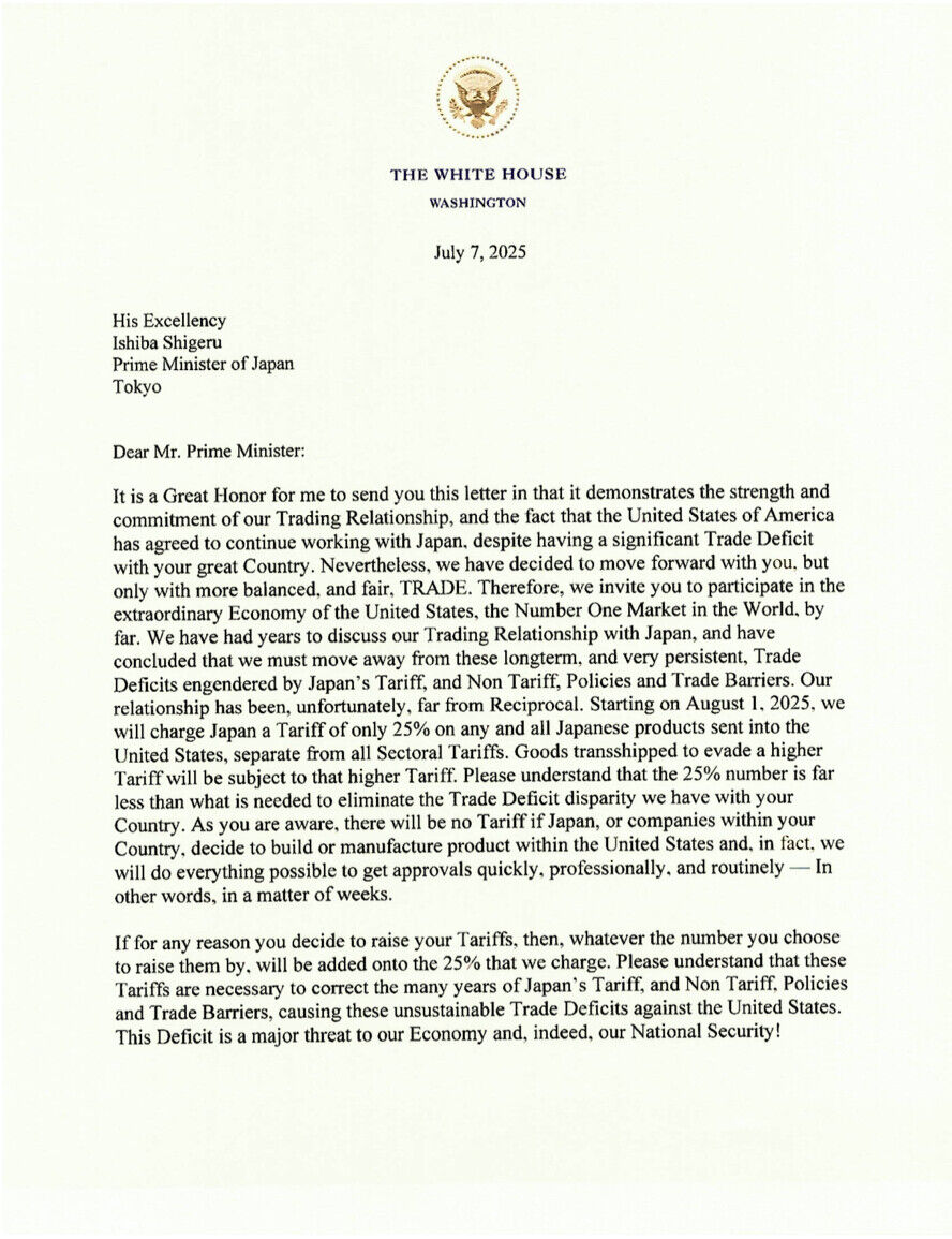 トランプ米大統領が7日、日本に25%の関税を課すことを通告する書簡を公表した。全文の日本語訳は次のとおり。