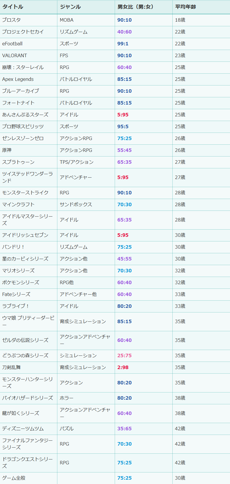 日本における代表的なゲームの男女比や平均年齢がこちら