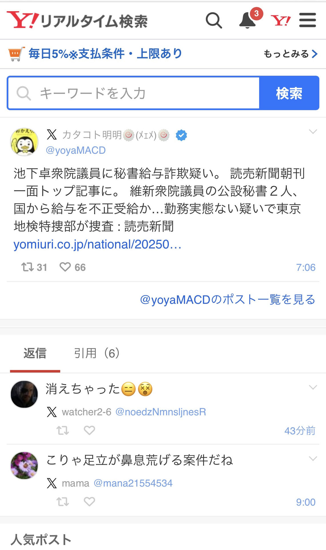 読売新聞1面で「維新の”池下卓”衆院議員を捜査!公設秘書の給与不正受給か!」と掲載し、ネットにも記事を上げる