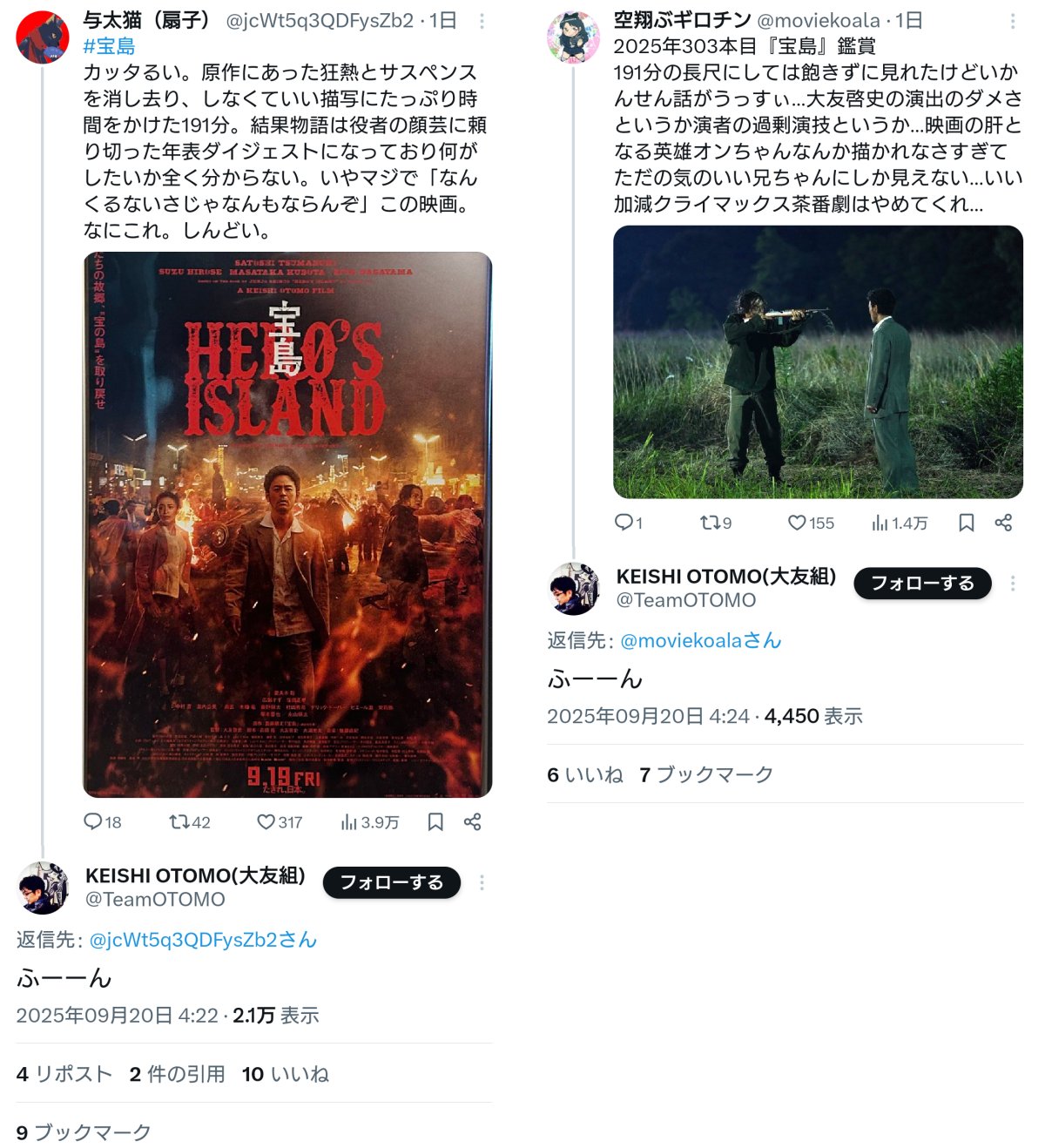 映画監督が一般人の批評に反応すべきではないとは思わないけれど、しかし『宝島』大友啓史監督のこれは「ウザ絡み」としか言いようがない。